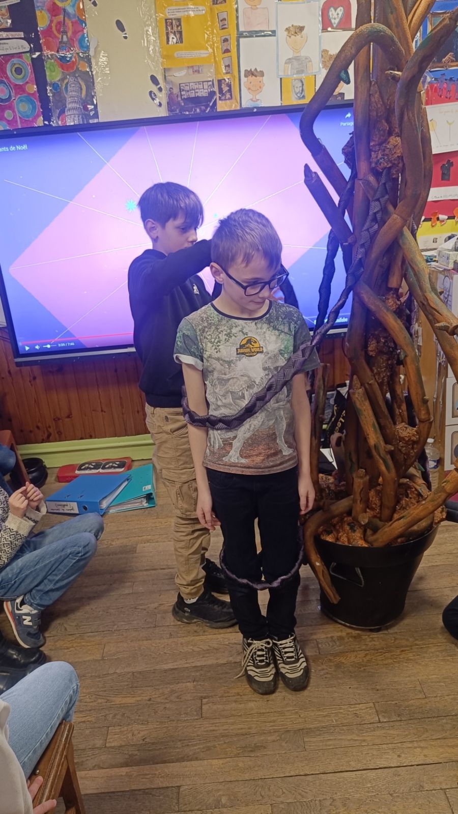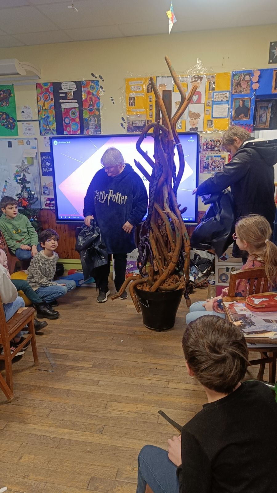 On était en train de chanter Père Noël frappe à la porte toc toc toc quand toc toc toc quelqu’un a frappé à notre porte. C’était Dominique! Elle nous a ramené le filet du diable qu’elle a confectionné pour notre spectacle: